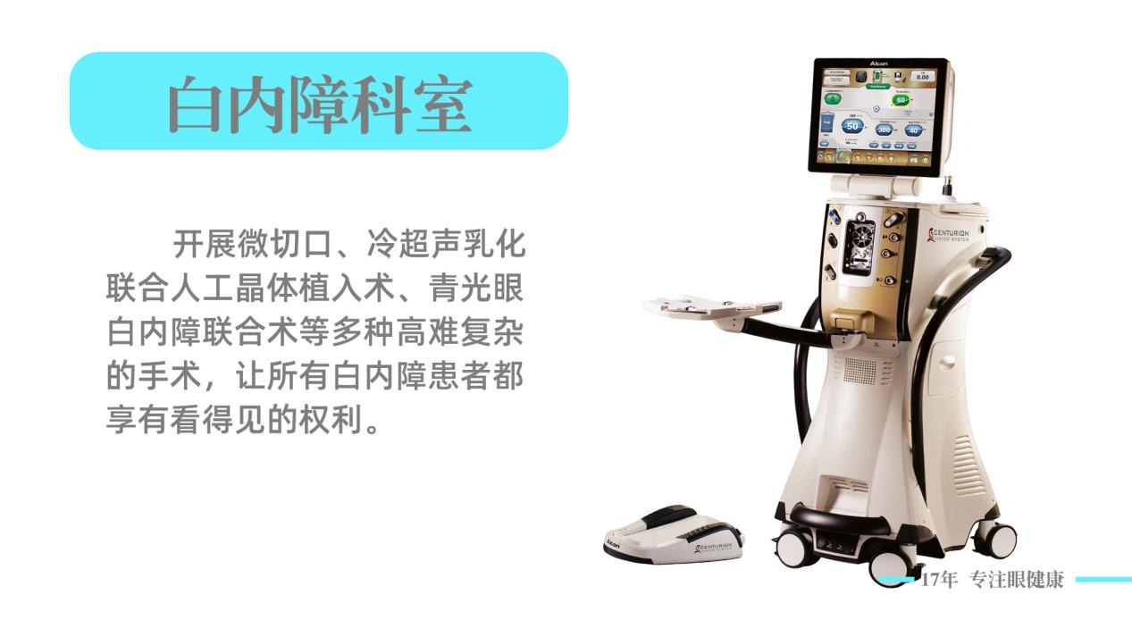 白内障手术是我院的优势项目,在省内较早开展双手微切口、同轴微切口、白内障冷超声乳化联合人工晶体植入术、散光晶体植入术、多